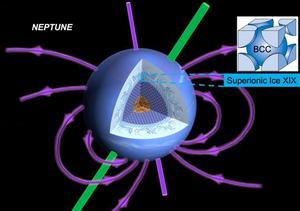 DOE/US Department of EnergyFor the first time, scientists have direct evidence of an exotic state of ice that may form inside Uranus, Neptune, and other water-rich gas giants due to extreme temperatures and pressures. The research shows that this phase, Ice XIX, has oxygen atoms packed in a body-centered cubic structure but hydrogen atoms that move freely like a fluid, increasing electrical conductivity. This may explain Voyager II’s observations of these planets’ magnetic fields.