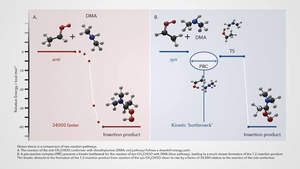 The air pollutant secondary organic aerosol (SOA) forms when ammonia and amines react with oxygenated species. When ammonia is present when alkenes react with ozone, SOA increases in size and numbers. This may be due to Criegee intermediates. New research found that a particular amine, dimethylamine, reacts 34,000 times faster with one version of the Criegee intermediate acetaldehyde oxide than with another version of the same compound.