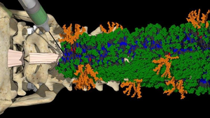 Researchers have created an injectable therapy for spinal cord injuries that uses specially engineered molecules that trigger a healing response in spinal cells. These molecules come together to form tiny fibers in a liquid solution. Scientists can control the motion of these fibers, allowing the fibers to connect more effectively with cells in the spine. The research may lead to a cure for spinal injuries in humans.