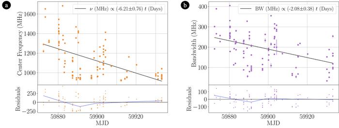 Two FRB 20220912A dataset parameters — center frequency and bandwidth — plotted over time, in MJD, from the beginning of the campaign to the end of the campaign (a time period of approximately 60 days). Panel a) indicates that the central frequency of the FRB decreases through the campaign (with residuals from the fit and a LOWESS non-parametric guideline shown below in blue). Panel b) shows the same decrease over time for bandwidth.