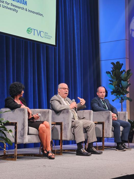 Moe Khaleel, center, associate laboratory director for national security sciences at ORNL, joined Padma Raghavan, left, vice provost for research and innovation at Vanderbilt University, and Ryan Luley, right, with the Information Warfare Division of the U.S. Air Force Research Laboratory, on Wednesday for a panel discussion titled, "Dependable AI for National Security" during the Tennessee Valley Corridor National Summit 2024 in Nashville, Tenn.