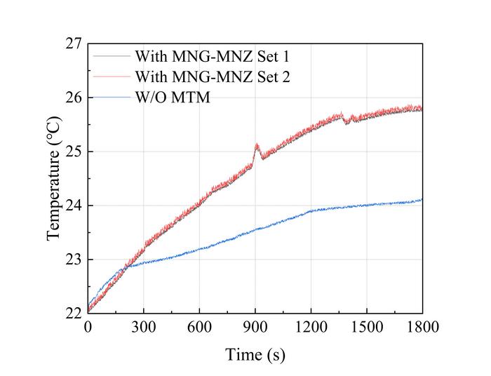 To verify the temperature rise during operation of the MCR-WPT system based on MNG-MNZ metamaterial, we conducted 2 sets of temperature rise experiments on the MCR-WPT system with MNG-MNZ metamaterial and 1 set of experiment without metamaterial at room temperature of 22 ℃. Temperature data were collected by STM32 one-chip computer once per second. The temperature results of different sets of temperature rise experiments are as shown in Fig.