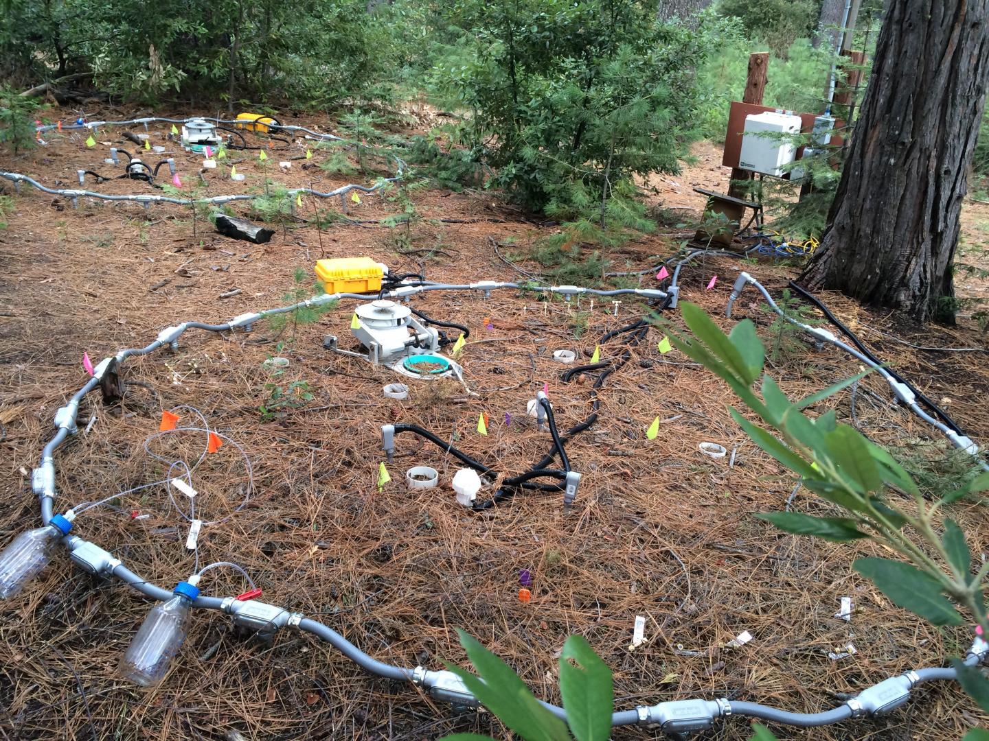 One of the approved FICUS JGI-EMSL FY20 proposals is led by Eoin Brodie of Lawrence Berkeley National Laboratory (Berkeley Lab). It involves a deep soil warming experiment at the University of California, Blodgett Forest Research Station, located in Georgetown, Calif., in the foothills of the Sierra Nevada mountains. Figure shows paired control (ambient temperature) and warmed (ambient +4oC) plots. Soil warming is achieved through heating cables to a depth of 1m below surface and has been ongoing for approximately five years. Infrastructure for measurement of temperature, moisture, gas fluxes, and dissolved constituents are shown.