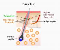 Diagram of a hair follicle taken from back fur. This study found that when Itg-beta5 was present in hair follicle stem cells located in the upper bulge of the follicle, the hair went through many more cycles than when those cells were absent.