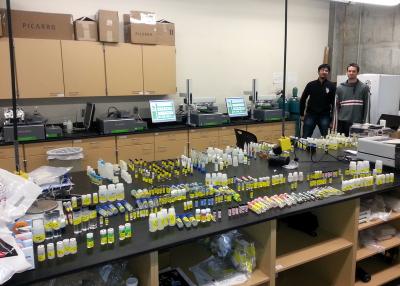 This shows Yusuf Jameel and Dan Davis, Ph.D. students in the lab at University of Utah with crowdsourced rainwater samples collected during Superstorm Sandy in 2012.
