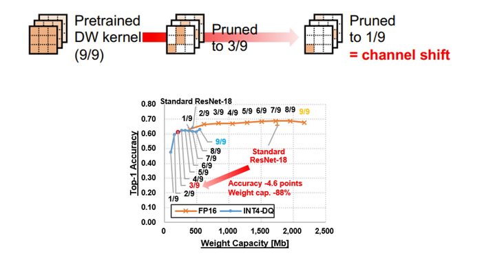 The trained model was pruned by removing the lowest weight in each channel. Only one element remains after 8 rounds of pruning (pruned to 1/9). Each of the pruned models is then subjected to dynamic quantization.