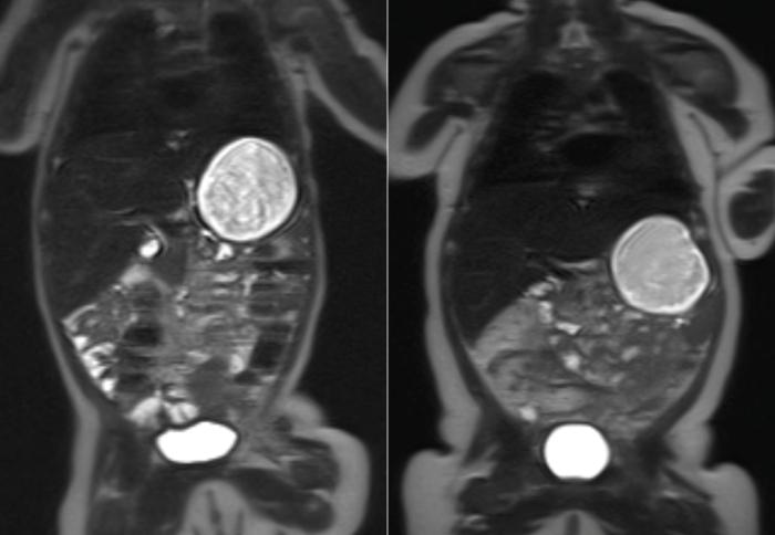 These are MRI scans of two babies at ten weeks old. The child on the left was born to a healthy mother, while the child on the right was born to a mother with gestational diabetes. The white area on the outside of the body is fat tissue. (The large white circle in the body is milk in the stomach)