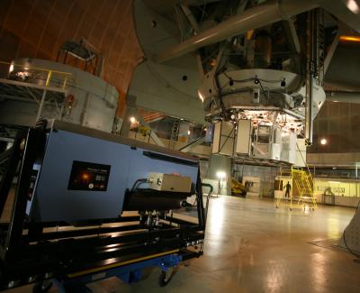 This photo shows the Project 1640 instrument in the telescope dome of the 200-inch Hale Telescope at Palomar Observatory, prior to being installed for observations.
