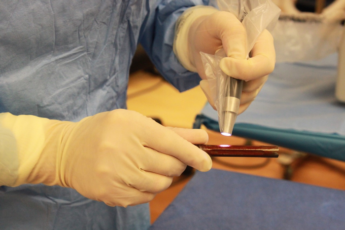 The mixture of self-assembling polymers and antibiotics is cured on human intramedullary hip implants using a handheld light source.