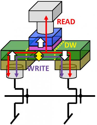 Schematic of a three-terminal memory device with current-induced domain wall motion. To write the information, current is applied to magnetic wire having domain wall (DW) to drag it.