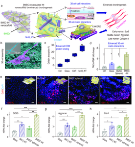 a)可注射干细胞组装体促进细胞-细胞/细胞-基质相互作用同时负载促软骨分化药物;b)ECM包覆和TGF-β3负载的MnO2纳米管示意图;c)FESEM图显示BMSC之间及其与一维纳米纤维之间紧密连接;d)通过重塑氧化微环境、增加细胞存活率和促进移植细胞软骨分化效率,实现增强软骨再生。