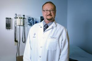 Dr. Pedram Gerami examines the skin of patient and melanoma survivor Heidi Tarr...Northwestern University