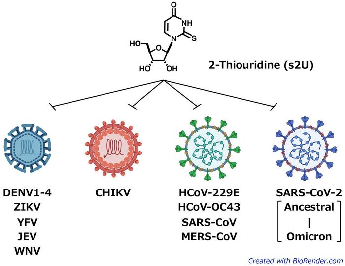 image: The newly identified 2-thiouridine (s2U) shows broad-spectrum antiviral activity against various ssRNA+ viruses including DENV, CHIKV, and SARS-CoV-2. (Kentaro Uemura, created with Biorender.com)
