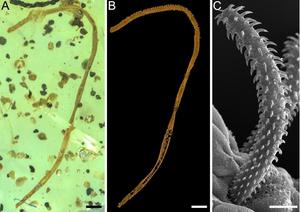 Along with the remarkable example of a marine endoparasite trapped in amber, some gleicheniacean trichomes and a scale insect nymph were also preserved with the partial worm fossil in the same amber specimen. This clearly indicates a terrestrial or onshore environment at the time of entrapment in resin. In addition, many sand grains were evenly distributed throughout the amber, suggesting that the fossil was entombed in a sandy environment. Furthermore, previous evidence shows that the Kachin amber was deposited in a near-shore environment.