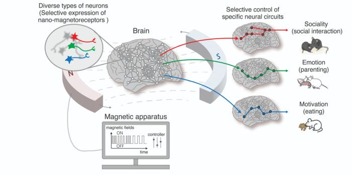 Researchers at the IBS have successfully developed a cutting-edge magnetogenetics technology called Nano-MIND, which enables wireless and remote control of specific brain regions to modulate complex brain functions such as emotions, social behaviors, and motivation in animals. This advanced technology leverages magnetic fields and magnetized nanoparticles to selectively activate targeted brain circuits. The key innovation lies in the selective expression of nano-magnetoreceptors in specific neuronal types and brain circuits and activating them with rotating magnetic fields at precise moments, allowing for spatiotemporal control of neural activity.