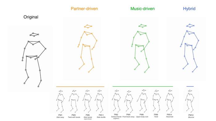 En examinant ces mouvements, les chercheurs ont démontré que des pas de danse distincts se synchronisent soit par la vision du partenaire, indépendamment de la musique (même lorsqu'une musique différente est écoutée), soit par la musique, indépendamment des mouvements du partenaire (même si le partenaire bouge de manière totalement différente). Il existe donc deux façons de se synchroniser : l'une guidée par la musique, appelée "music-driven", et l'autre guidée par le mouvement, appelée "partner-driven". Ces deux synchronisations sont indépendantes l'une de l'autre et peuvent même se produire simultanément sans interférer l'une avec l'autre.