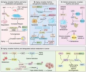 There exists a complex synergistic relationship among cancer, circadian rhythms, and aging: aging is a major risk factor for cancer, disruption of circadian rhythms promotes tumor initiation and progression, and aging itself exacerbates circadian dysregulation. These three interact through shared mechanisms such as genomic instability, cellular senescence, and chronic inflammation. Their intricate relationship provides new directions for the clinical management of cancer.