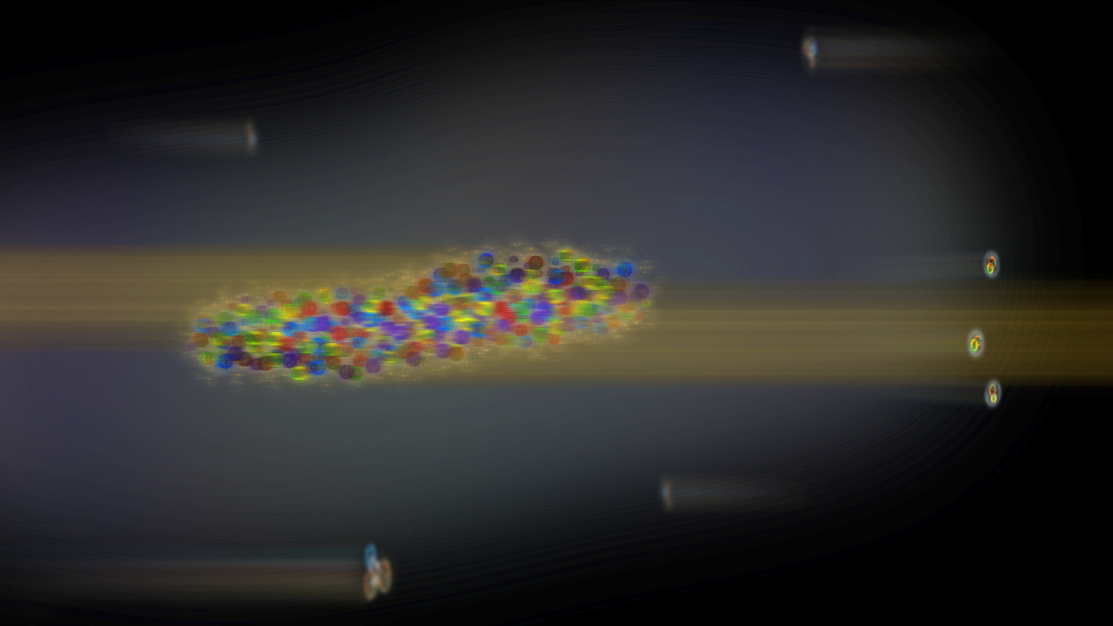 In collisions of counter-propagating proton beams, hadronisation processes can be studied. Detectors register secondary particles produced directly in the collision region or from the decays of long-lived particles within the surrounding halo. Quantum correlations between triplets of pi mesons (on the right) provide information about the details of the process, indicating coherent particle emission. (Source: IFJ PAN)