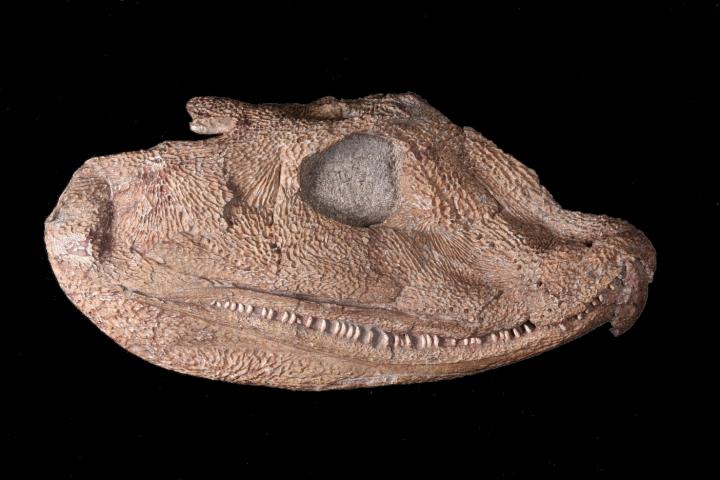 image: This is the original fossil skull of Acanthostega gunnari, a 360-million-year-old near-ancestor of land vertebrates. Scientists at the Universities of Bristol and Cambridge, UK have created a 3-D reconstruction of the skull which differs from earlier 2-D reconstructions and suggests such creatures, which lived their lives primarily in shallow water environments, were more like modern crocodiles than previously thought. view more