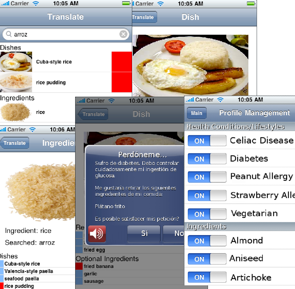 The system warns people when certain ingredients or nutrients are contained in a dish. When there is doubt about an ingredient's safety, a warning symbol is displayed next to the dish and the device suggests questions and answers, written in both languages, so the user and the restaurant staff can discuss the content of the dish and possible alternatives.
