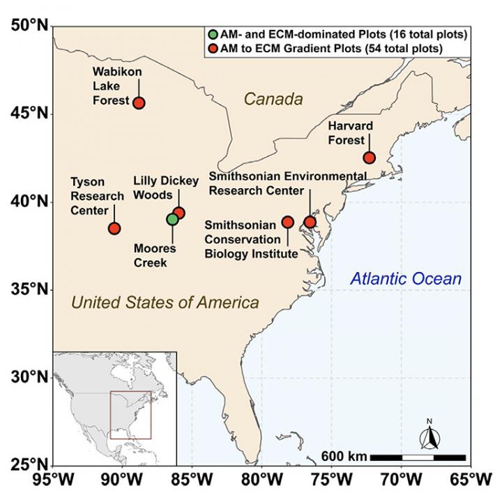 In two studies, published in Global Change Biology and Ecology Letters, the researchers reported that forest stands dominated by trees that associate with arbuscular mycorrhizal (AM) fungi differ from stands dominated by trees that associate with ectomycorrhizal (ECM) fungi in terms of how they store and retain carbon and nitrogen.