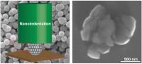 Rice University materials scientists tested structures made of calcium-silicate nanoparticles and found that particles go from brittle to ductile as they increase in size. The compressed single particle at left deformed under the pressure of a nanoindenter. At center and right, large particles did not crack under pressure. (Credit: Multiscale Materials Laboratory/Rice University)
