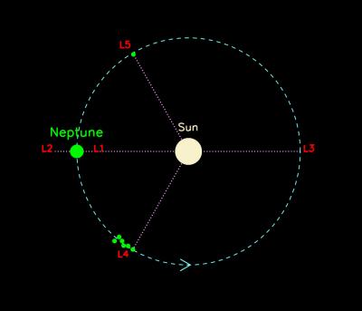 image: The five Lagrangian points of stability are shown at Neptune. view more