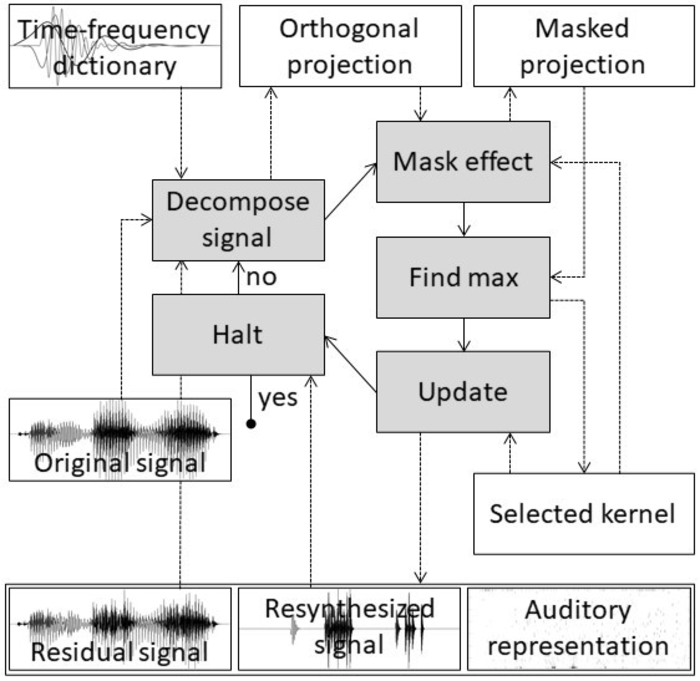 image: Processing pipeline of perceptual matching pursuit algorithm used to derive auditory sparse representations from speech signals. The five main processing steps are illustrated by gray blocks and solid arrows. The first step is to decompose signal, second is to apply mask effect, third is to find max, fourth is to update, and last is to halt. Information about selected kernel found after find-max step is used to create auditory sparse representation, resynthesized signal, and residual signal. view more