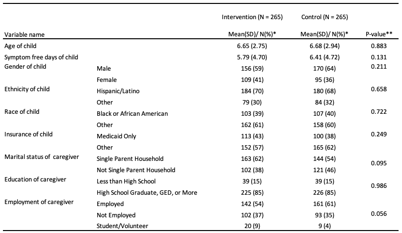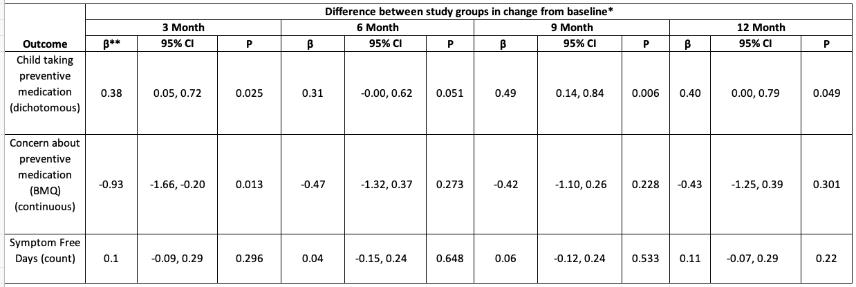 We enrolled 530 children (intervention N= 265, control N= 265, response rate 91%). Intervention and control group children had similar demographic characteristics and asthma symptoms at baseline (Table 1). After adjusting for seasonality, children in the intervention group had greater change in odds of preventive medication use compared to the control group at the 3, 9, and 12 month follow-ups [β = 0.38 (95% CI (0.05, 0.72), 0.49 (0.14, 0.84), 0.40 (0.00, 0.79), respectively; Table 2]. While there were no differences in asthma symptoms between groups, the change in the odds of any asthma related health care utilization was lower in the intervention group compared to the control group at the 12 month follow up [β = -0.53 (95%CI -1.03,-0.03)]. Caregivers in the intervention group also reported less concern about preventive medications at 3 months [β = -0.93; 95%CI (-1.66, -0.20)].