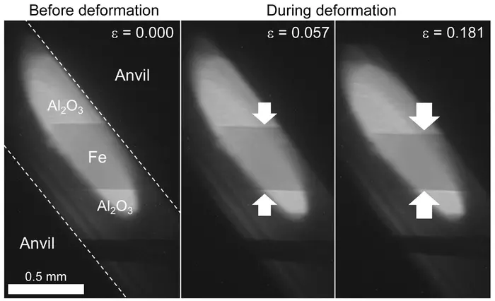 image: X-ray radiographic images before and during deformation experiments of hcp-iron at 16.5-17.5 GPa and 823-873 K. The sample strain during deformation was determined from these radiographs. view more