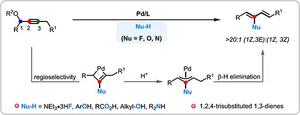 Chinese Chemical SocietyThe research team led by Liang'an Chen from Nanjing Normal University and Liangliang Song from Nanjing Forestry University has made a new breakthrough in the field of conjugated diene chemistry. Based on the neutral reaction mechanism of oxidative addition-reductive elimination and utilizing a ligand angle control strategy, they achieved palladium-catalyzed regio-, chemo-, and stereoselective coupling of propargyl alcohol esters with a variety of nucleophiles (including fluorides, phenols, alcohols, carboxylic acids, and amides), constructing a series of high-value-added multi-substituted conjugated dienes. The practicality of this method has been demonstrated through the application and transformation of these functionalized 1,3-dienes in cycloaddition and coupling reactions, as well as the subsequent modification of natural products and bioactive molecules. The article was published as an open access research article in CCS Chemistry, the flagship journal of the Chinese Chemical Society.