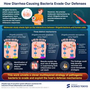Bacteria uses multiple defense mechanisms to survive in the host body. Shigella bacteria, that causes colitis, disable multiple host defense pathways using three specialized effector proteins, as reported by researchers from Japan. They found that these effectors suppress inflammation, block apoptosis, and prevent necroptosis in human cells, allowing the pathogen to replicate. This study offers new insights that could help develop vaccines and targeted therapies to manage inflammatory colitis.