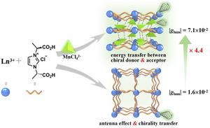 Owing to their tunable structures and strong emission, chiral metal–organic frameworks (CMOFs) incorporating rare-earth ions hold great promise for circularly polarized luminescence (CPL). Herein, enantiomeric rare-earth CMOFs are synthesized via the direct self-assembly of optically pure ligands (1,3-bis((S)- and (R)-1-carboxyethyl)-1H-imidazol-3-ium chlorides) with Tb3+ ions and shown to exhibit CPL with a dissymmetry factor (|glum|) of 0.016, which is attributed to efficient chirality transfer and the antenna effect. The introduction of a luminescent guest (MnCl42−) into the framework channels markedly enhances CPL and increases |glum| to 0.071. The results of control experiments and spectral analysis indicate that this enhancement arises from the synergy between host–guest energy transfer and chirality transfer. This work describes a modular strategy for constructing CPL-active rare-earth CMOFs and provides a general design principle for tuning their chiroptical properties through host–guest interactions.