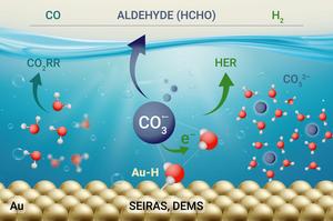 Researchers from the Helmholtz Zentrum Berlin (HZB) and the Fritz Haber Institute of the Max Planck Society (FHI) have uncovered how carbonate molecules affect the conversion of CO2 into valuable fuels on gold electrocatalysts. Their findings reveal key molecular mechanisms in CO2 electrocatalysis and hydrogen evolution, pointing to new strategies for improving energy efficiency and reaction selectivity.