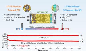 Tsinghua University PressSulfide-based all-solid-state lithium metal batteries (ASSLMBs) are promising for high-energy-density and safe energy storage. But the poor compatibility of sulfide electrolytes with both high-voltage cathodes and lithium metal anodes hinders their practical application. Here, Professor Xie Jia's group from Huazhong University of Science and Technology discloses a fluorine-nitrogen synergistic interfacial engineering strategy by modifying Li5.5PS4.5Cl1.5 (LPSC) with lithium bis(trifluoromethanesulfonyl)imide (LiTFSI). The modified LPSC electrolyte shows a high ionic conductivity of 2.88 mS/cm. Moreover, LiTFSI induced dual-functional interphases, a fluorine-rich CEI (LiF/LixPOyFz) and a fluorine-nitrogen composite SEI (Li3N/LiF/LixPOyFz), contributing to high oxidation stability (LiNi0.8Co0.1Mn0.1O2//LiIn battery retains 107% capacity retention after 13000 cycles at 15 C) and excellent lithium dendrite inhibition ability (Li//Li: CCD 3.4 mA/cm2, stably cycling 2600 h at 0.5 mA/cm2). As a result, the LiNi0.8Co0.1Mn0.1O2//Li cell with modified electrolyte demonstrates 1000 stable cycles at a high cut-off voltage of 4.5 V and wide-temperature adaptability (-20~50 ℃). This work shows a facile and effective method for constructing long-life high-energy-density sulfide based ASSLMBs.
