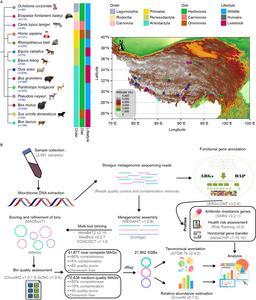 A large-scale metagenomic study of 2,561 gut samples from 14 mammal species on the Tibetan Plateau reconstructed 112,313 metagenome-assembled genomes representing 21,902 microbial species (86% unclassified) and identified 8,598 nonredundant antibiotic resistance genes (ARGs) spanning 28 types. The authors report 334 high-risk ARGs and seven cross-species horizontal gene transfer events involving high-risk ARGs, including three transfers between humans and nonhuman mammals. Additionally, the abundance of ARGs in human gut microbiomes on the Tibetan Plateau was greater than that in those from eastern China, Europe, and the United States, whereas the abundance of ARGs in livestock gut microbiomes from the Tibetan Plateau was lower than that in livestock gut microbiomes from those regions. This study reveals that the gut microbiota of Tibetan Plateau mammals is a largely unexplored resource and a significant reservoir of ARGs, offering crucial insights into microbiome research and demonstrating potential public health implications.