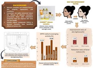 This study provided a comprehensive evaluation of CHARMS™ skincare cosmetics in terms of their ability to improve skin tone, their antioxidant properties, and the presence of volatile organic compounds (VOCs) with potential skin benefits. Skincare efficacy has become a growing consumer concern, particularly regarding antioxidant activity and skin-lightening effects. Using a clinical trial on 20 female volunteers, the research revealed that CHARMS™ products significantly enhanced skin appearance, with a 3.23% improvement in skin lightness and a 5.75% reduction in skin redness.
