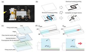 Origami device fabrication has huge potential in the fields of health, agriculture, and space technology. However, portability of the presently used fabrication devices is a concern and on-site production of three-dimensional (3D) devices remains a challenge. To address this, researchers have developed a portable, multimaterial printer using electrowetting on dielectric technology. This device allows rapid fabrication of 3D devices, eliminating the challenges of the existing technologies and improving the applicability of paper-based devices.