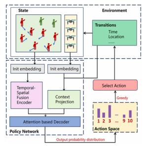 Dynamic multi-robot task allocation (MRTA) requires real-time responsiveness and adaptability to rapidly changing con ditions. Existing methods, primarily based on static data and centralized architectures, often fail in dynamic environments that require decentralized, context-aware decisions. To address these challenges, this paper proposes a novel graph reinforce ment learning (GRL) architecture, named Spatial-Temporal Fusing Reinforcement Learning (STFRL), to address real-time distributed target allocation problems in search and rescue scenarios. The proposed policy network includes an encoder, which employs a Temporal-Spatial Fusing Encoder (TSFE) to extract input features and a decoder uses multi-head attention (MHA) to perform distributed allocation based on the encoder’s output and context. The policy network is trained with the REINFORCEalgorithm.Experimentalcomparisonswithstate-of-the-artbaselinesdemonstratethatSTFRLachievessuperior performance in path cost, inference speed, and scalability, highlighting its robustness and efficiency in complex, dynamic environments.